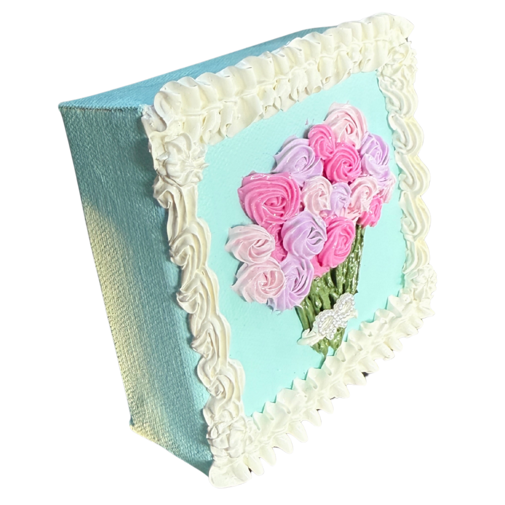Fall in love with this hand-piped 3D floral bouquet, a dreamy blend of artistry and charm. Against a rich teal blue background, delicate blooms in shades of pink, purple, and white burst to life, creating a soft, romantic centerpiece that feels both timeless and enchanting.