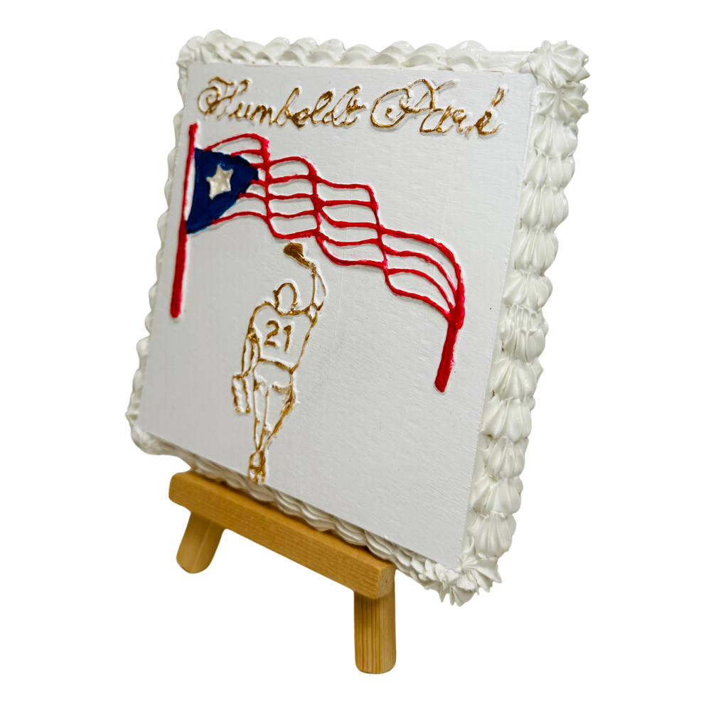 Toward the bottom, I sculpted and painted in gold the silhouette of Roberto Clemente, proudly wearing his #21 jersey. He’s shown tipping his hat to the Puerto Rican flag, gazing upward toward the Humboldt Park flag, which I hand-piped and lettered at the top. This layered story of strength, roots, and community comes to life through bold textures that pop off the canvas.
