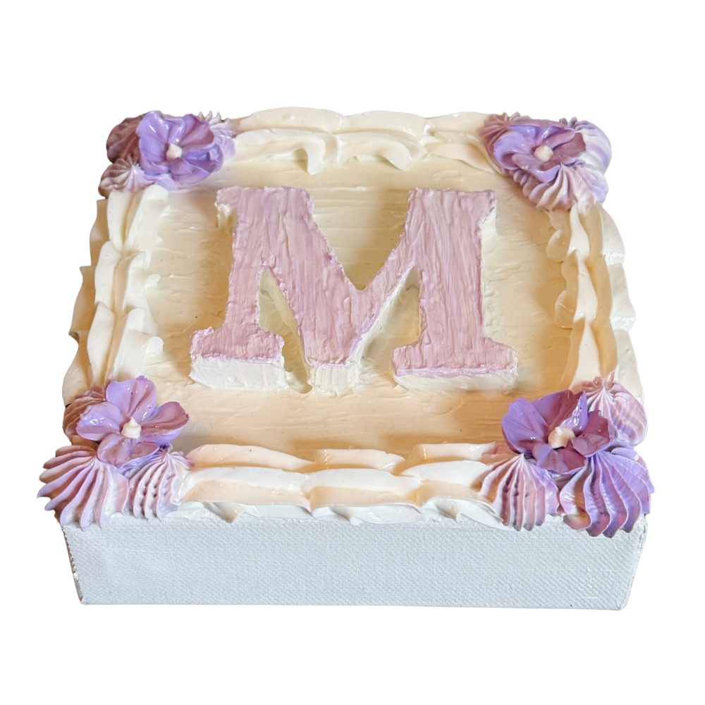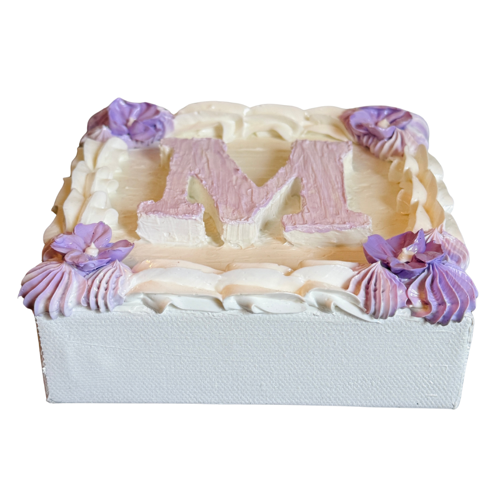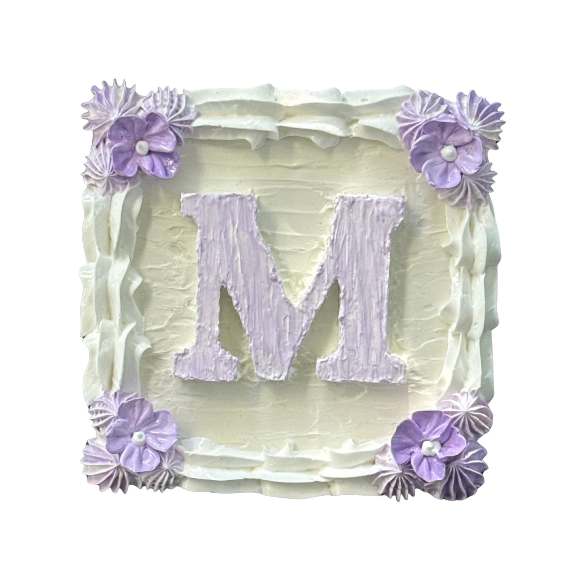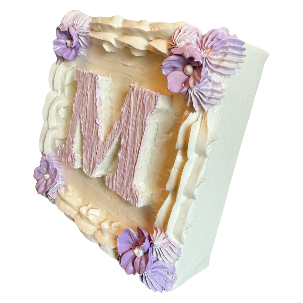 Sculpted with Gaffrey heavy-texture acrylic paint in light purple and white, the M sits proudly in the center. Along the top edge, piped acrylic paint creates a decorative frosting-like frame around the border, and soft purple dollops at each corner, some accent flowers to add a charming, playful touch.